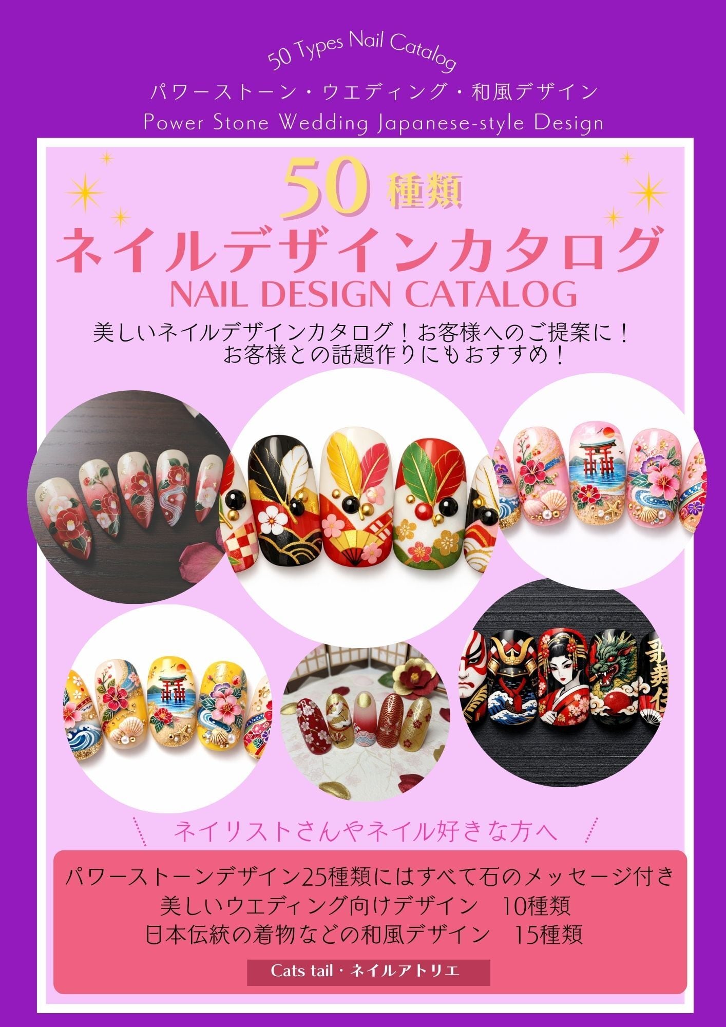 This nail design catalog features a wide variety of captivating designs themed around power stones, weddings, and traditional Japanese styles. Full of ideas to beautifully adorn your fingertips, it serves as inspiration for both self-nail art and special occasions.