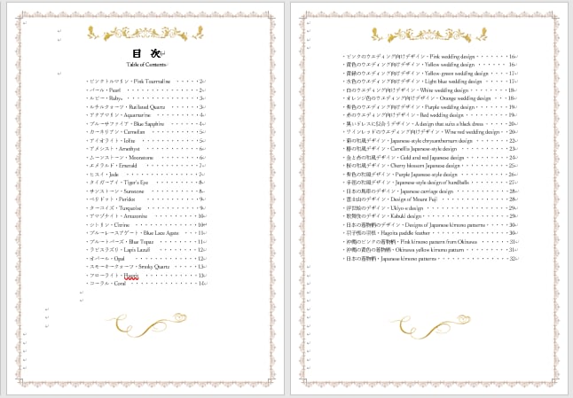 力強いパワーストーンのメッセージ付きです。石のエネルギーを取り入れた美しさや、ウェディングの特別な瞬間を引き立てる優雅さ、日本の雅な文化(浮世絵や歌舞伎なと)が息づくスタイルが特徴です。初心者から上級者の方まで楽しめる内容となっており、きっとお気に入りのスタイルが見つかります!